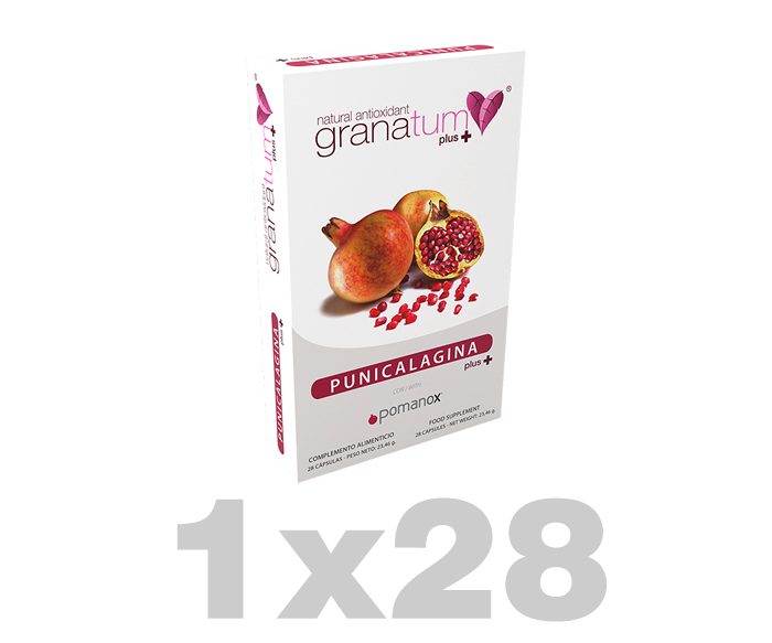 Ingredienser per kapsel : 670 mg granatäppelextrakt Pomanox (Punica Granatum L., frukt; 201 mg punicalaginer).